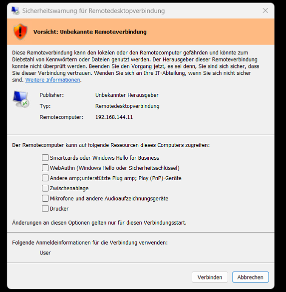 Problem: Seit den letzten Windows-Update vom 14.04.2026 erscheint beim Verbindungsaufbau eine Sicherheitswarnung bezüglich der Ressourcen-Umleitung (Smartcards, Zwischenablage etc.).